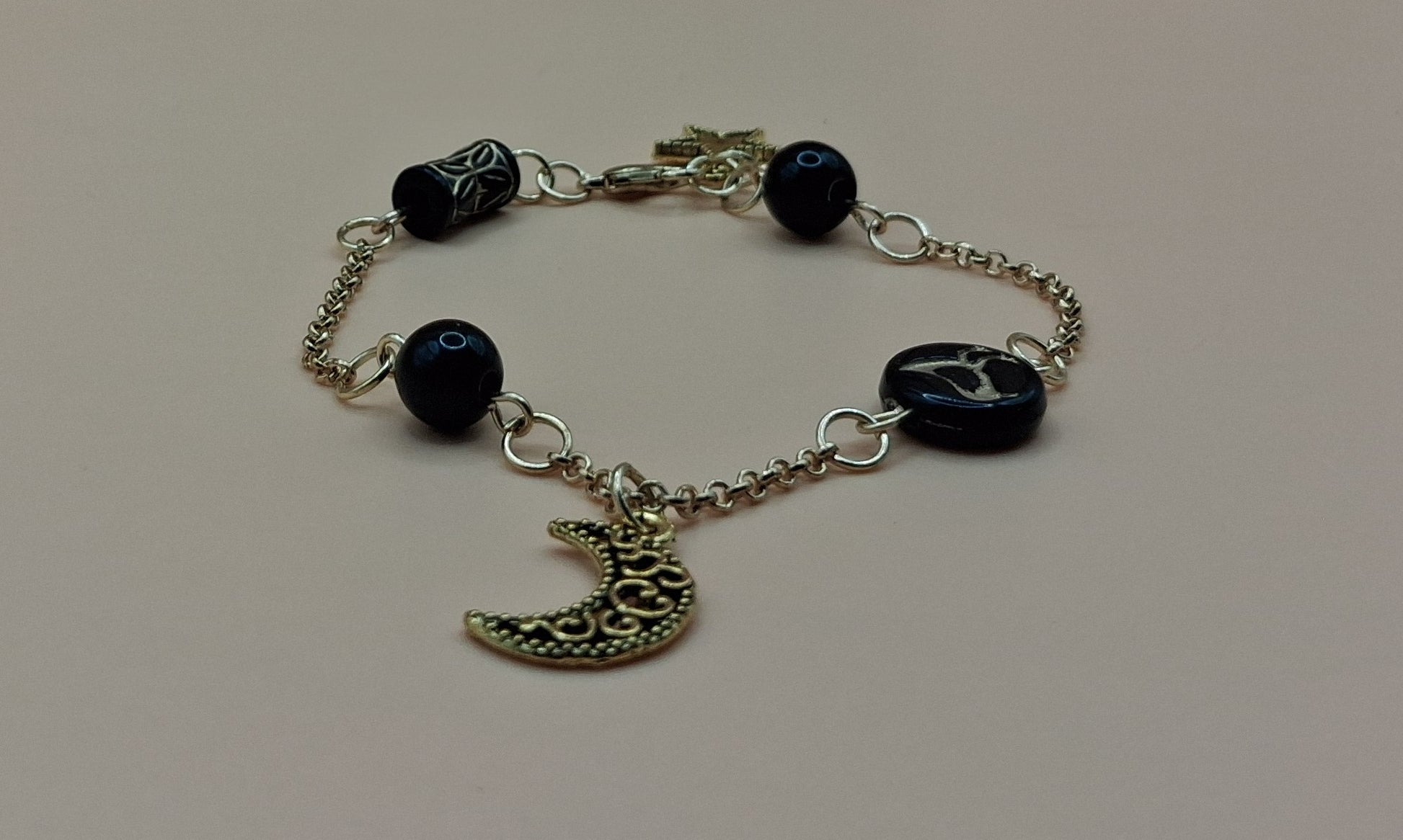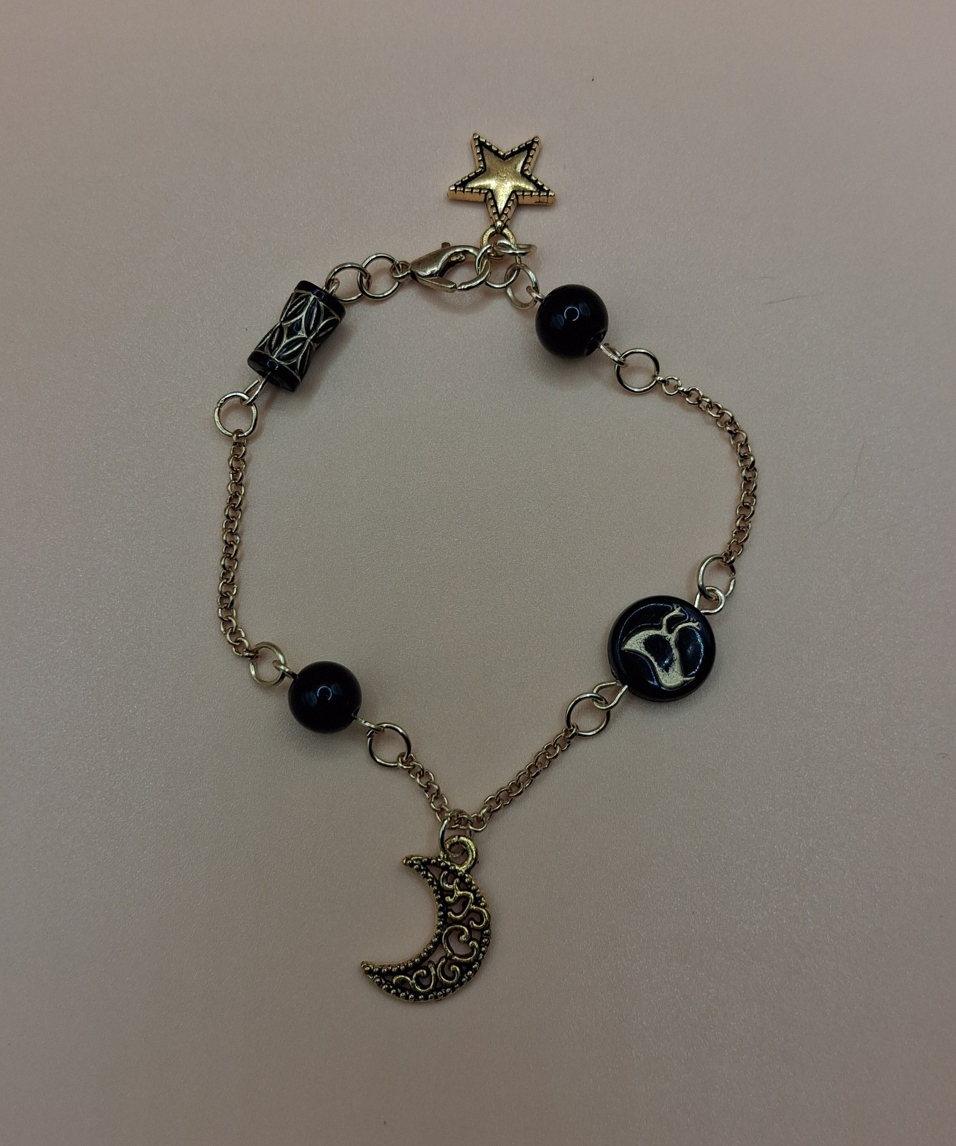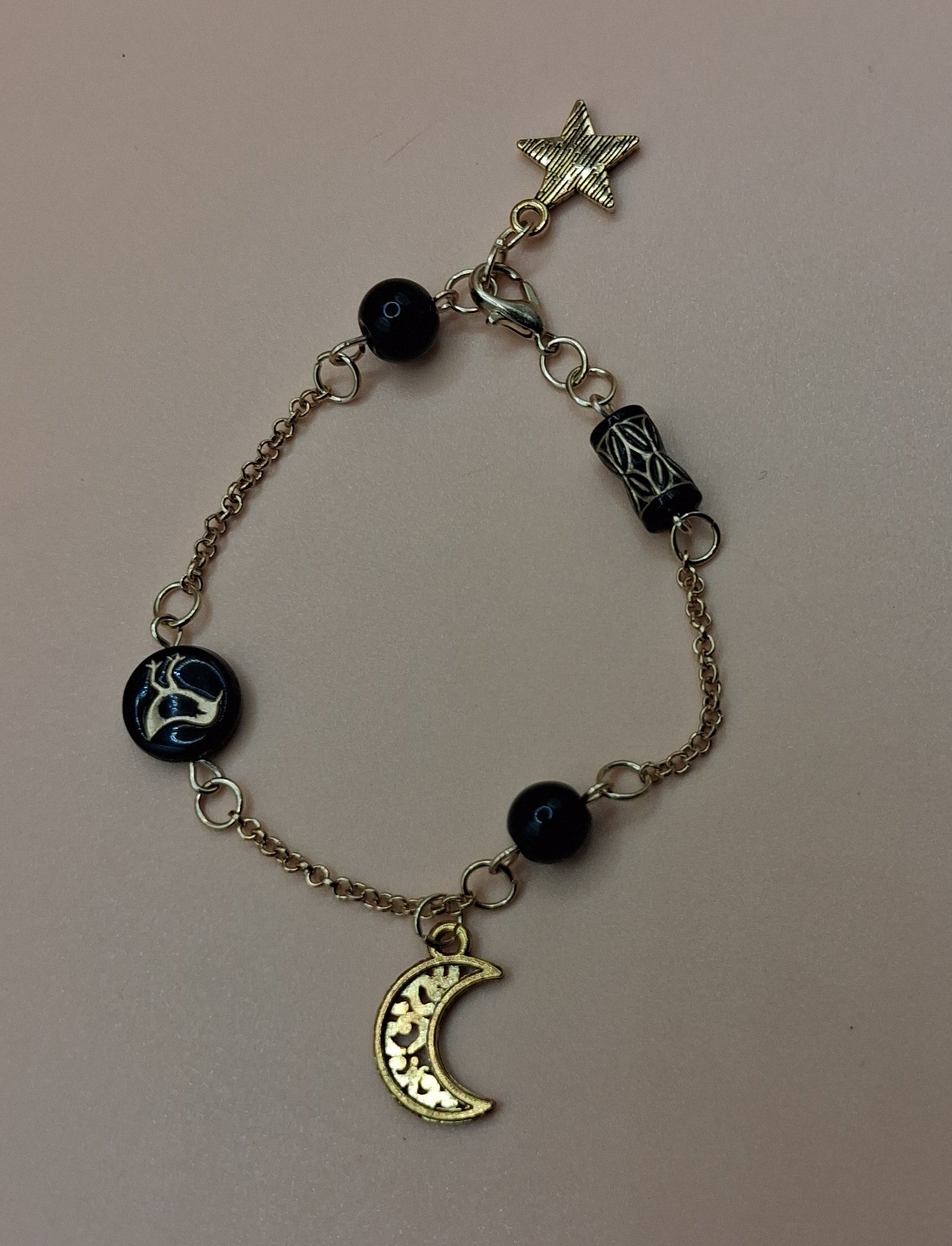 A delicate chain bracelet adorned with celestial charms and Vintage Baroque resin beads, featuring an intricately detailed crescent moon pendant and textured star clasp. Each element is carefully selected to create a harmonious balance of cosmic symbolism and timeless elegance.