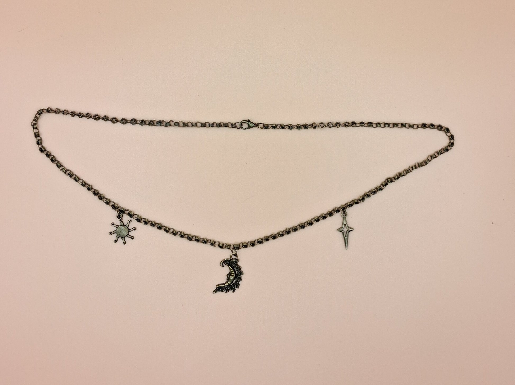 Embrace the magic of the cosmos with this handcrafted celestial necklace featuring three symbolic charms: a crescent moon, radiant sun, and guiding star.