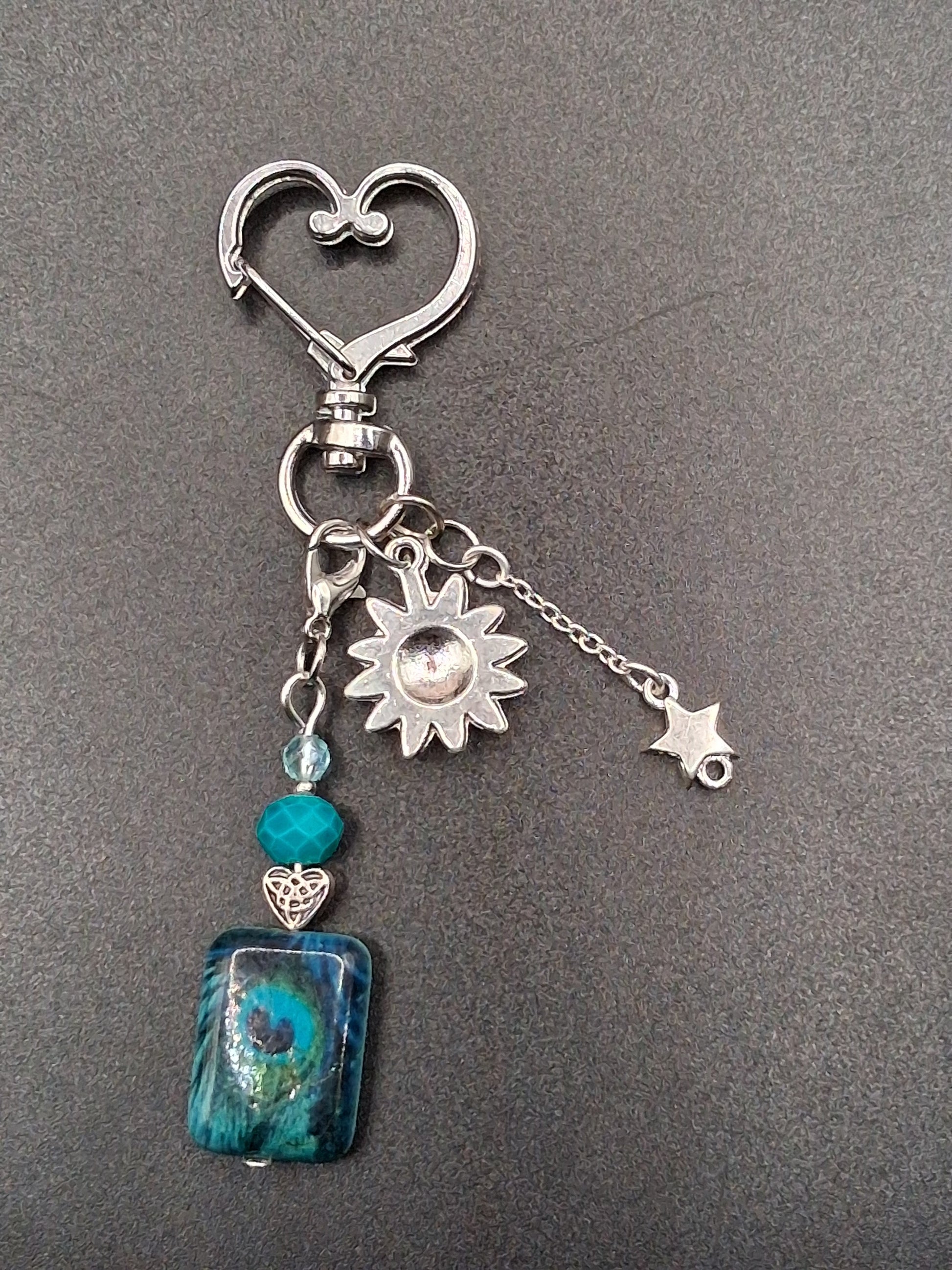 The focal point is a stunning turquoise peacock feather glass bead that echoes the iridescent beauty of ocean waves, complemented by turquoise coloured stone beads and silver-tone accents. Each charm tells its own story—the sun for warmth and vitality, the star for guidance and dreams.
