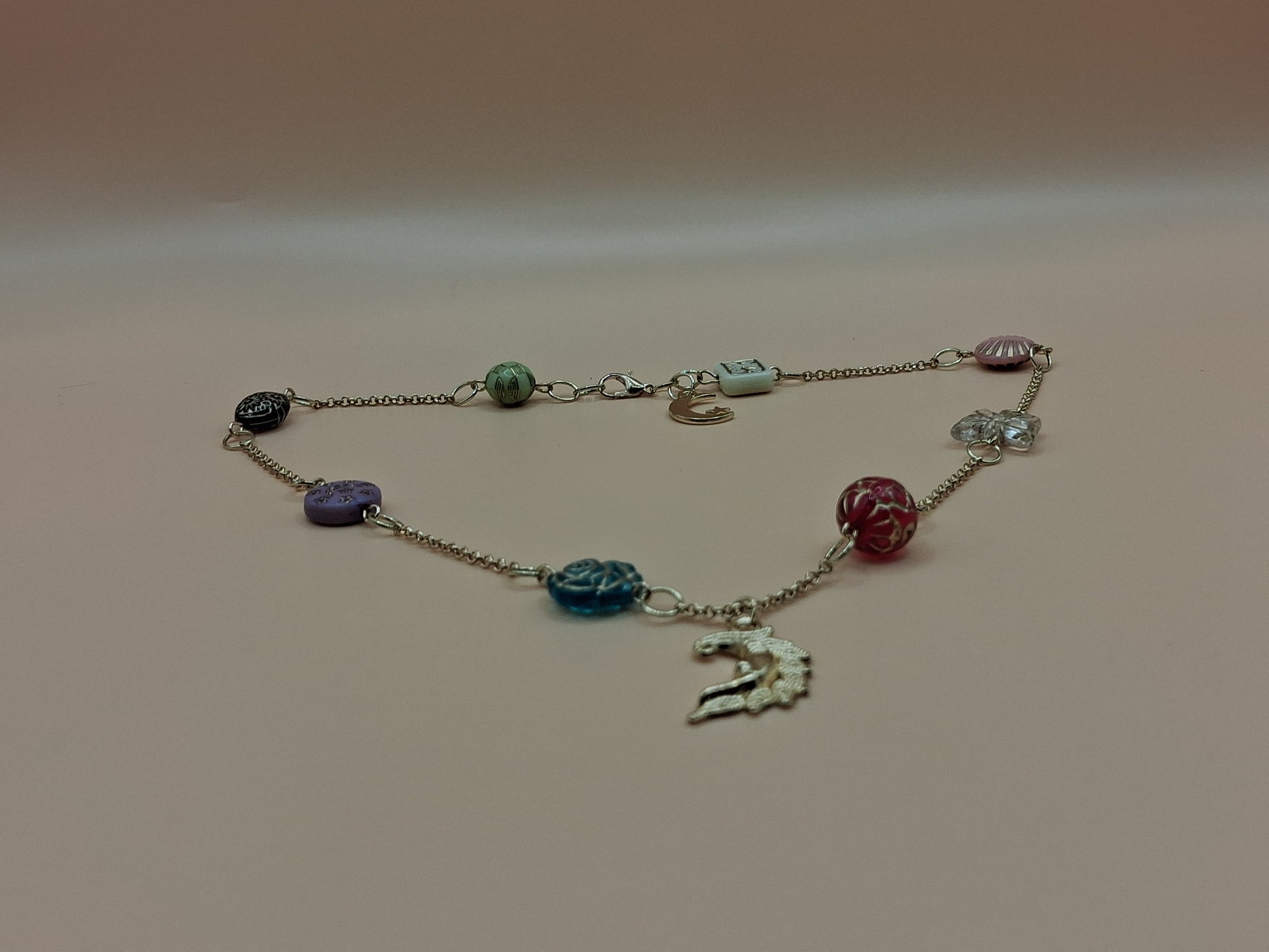 Delicate gold-toned chain links connect each bead, creating graceful movement and drape. The necklace is adorned with celestial and botanical charms including a crescent moon pendant, a four-leaf clover, and decorative metallic accents that catch the light beautifully.