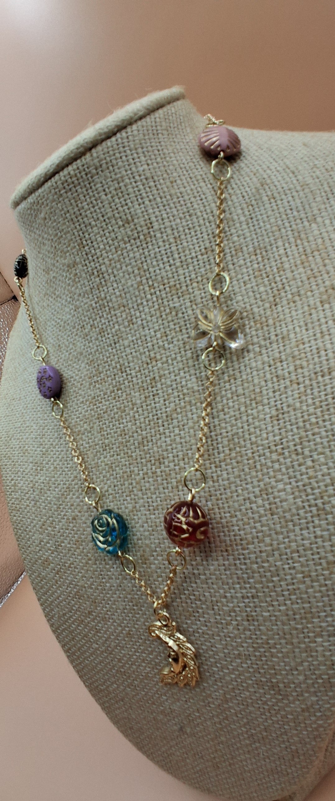 • Baroque resin rose beads in purple, teal, burgundy, and green