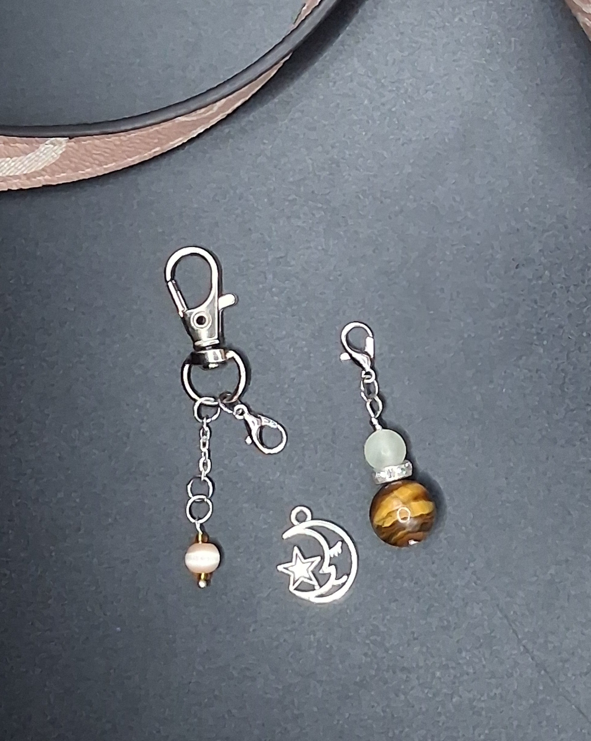 Each keyring is thoughtfully assembled to bring you a piece that's beautiful, meaningful and unique. Warm earth tones of tiger's eye complement the cool, soothing green of aventurine, while the pearl adds a touch of timeless sophistication.