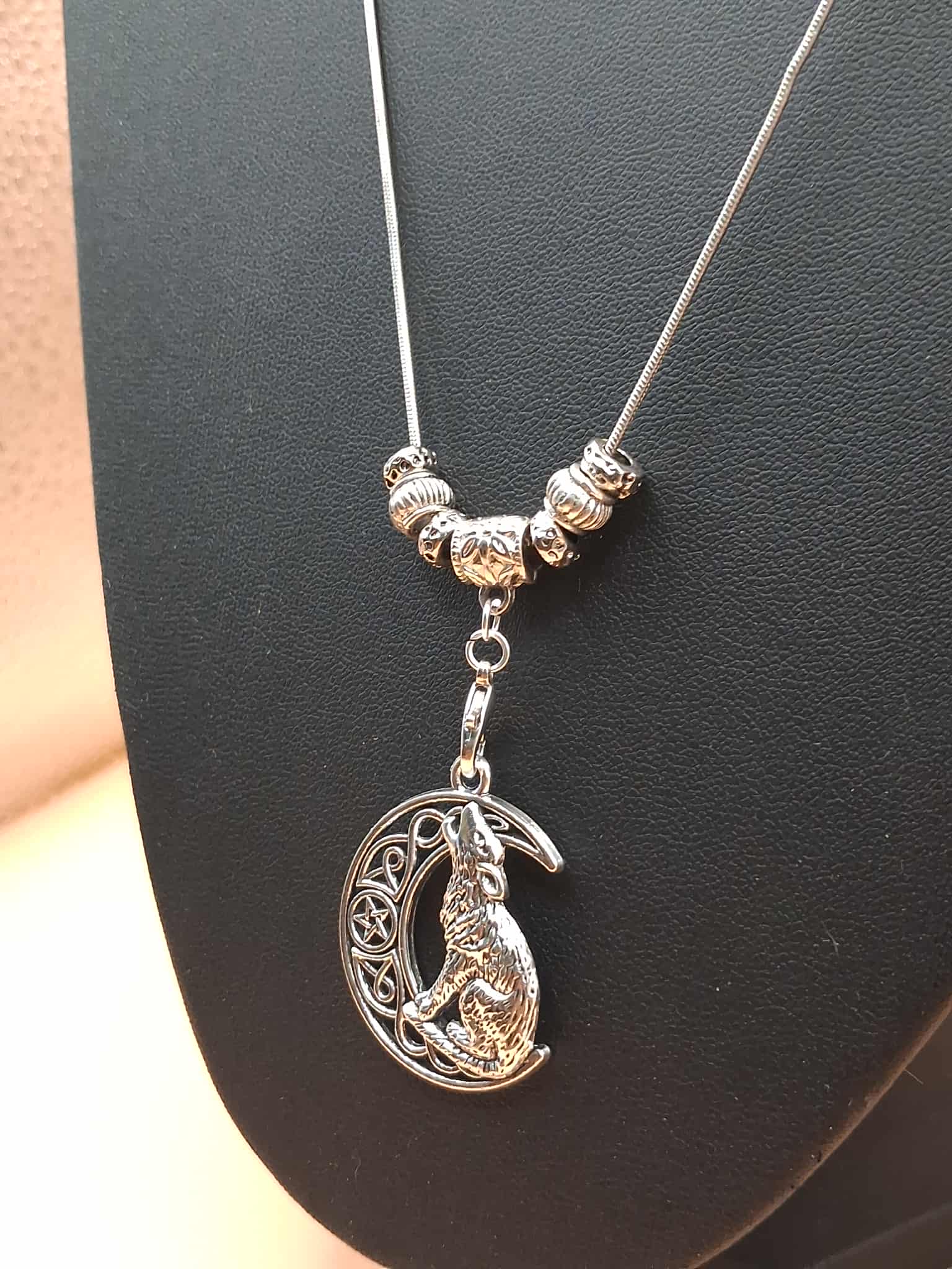 - Intricately detailed wolf and crescent moon pendant with filigree design
